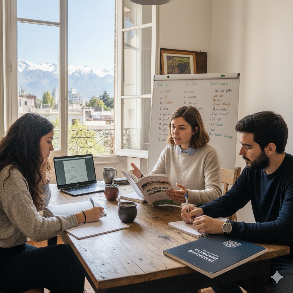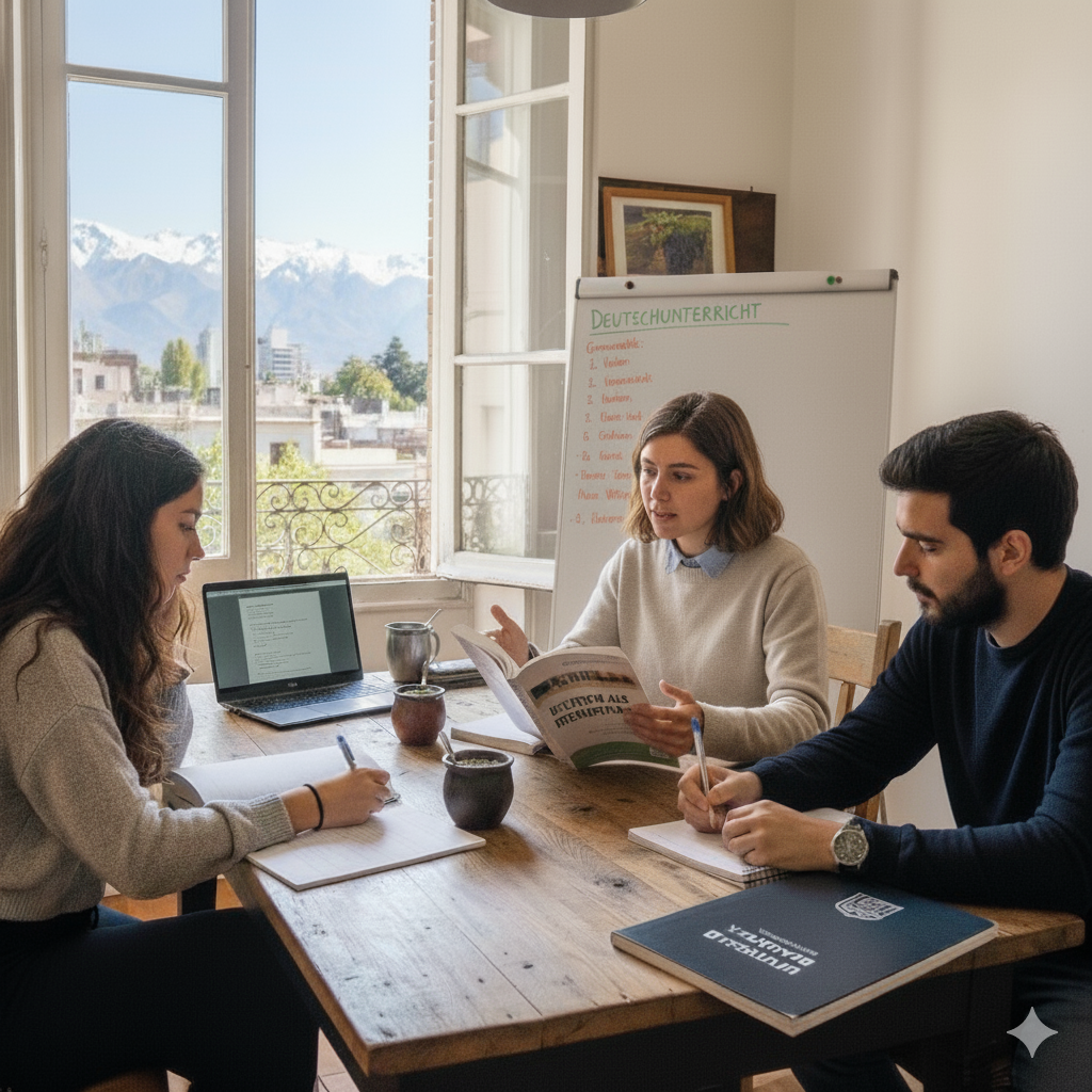 Se trabaja con manuales reconocidos como DaF Kompakt o Menschen, además de material complementario auténtico (videos, artículos, canciones, etc.).